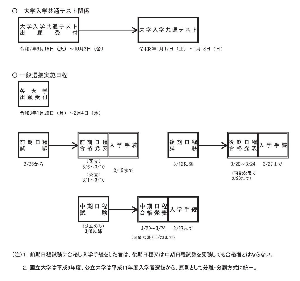国公立大学の一般選抜の実施日程は下図の通りである。